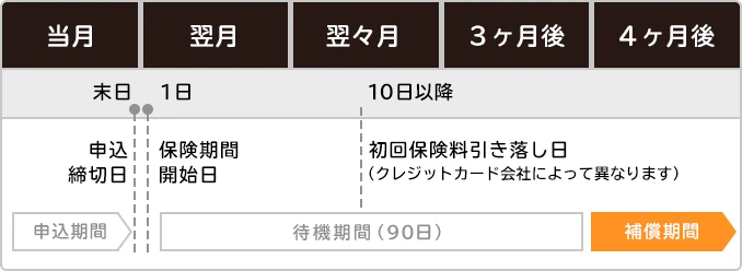 毎月末日までにお申込みいただいた場合、翌月1日から90日を経過した日の翌日の午前0時までの待機期間後に補償開始となります。